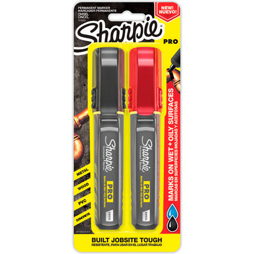 With permanent ink designed to mark on wet and oily surfaces, Sharpie PRO Permanent Markers are built jobsite-tough. The newly redesigned permanent markers better fit the needs of tradesmen with features like a medium-size anti-roll barrel shape, cap clip, lanyard loop, and more. The pack of 2 professional markers in black and red with a chisel tip will get the job done. - Pkg Qty 2.