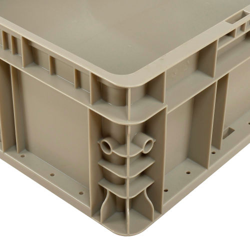 Efficiently transport goods or work in progress. These injection molded, high density gray polyethylene containers have reinforced corners to handle even the heaviest items, offering a stacking capacity of 50 lbs. Straight-walled sides allow various sizes to stack securely and fit accurately on standard sized pallets. Comfort grip handles on 2 sides.