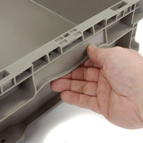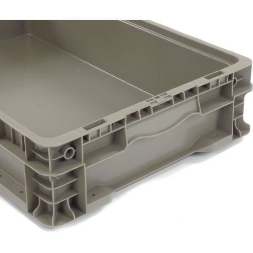 Efficiently transport goods or work in progress. These injection molded, high density gray polyethylene containers have reinforced corners to handle even the heaviest items, offering a stacking capacity of 50 lbs. Straight-walled sides allow various sizes to stack securely and fit accurately on standard sized pallets. Comfort grip handles on 2 sides.