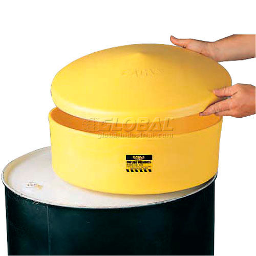 Eagle OVERSIZED SAFETY DRUM FUNNEL FOR NON-FLAMMABLE LIQUIDS safety funnel and cover constructed of chemical resistant polyethylene. 18"W fits 30 and 55 gallon drums. 6"H walls reduce splash. Spout fits any 2" NPT bung. Compliance: EPA 40 CFR 265.173. Optional Drum Funnel Cover keeps out dirt and contaminants (reference Eagle 1664; Global Model # 704541).