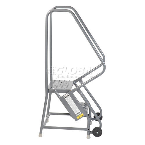 Tilt & Roll Rolling Ladder Perforated Step Heavy-duty 1-1/16" steel tubing makes this ladder ideal for warehouse use, stock picking or maintenance operations. This Perforated Step model has steel steps with slip-resistant openings for added traction. Tilt ladder forward on two 4" wheels to move from job to job. 4 large rubber end caps protect floor surfaces. 7" deep steps, 10" deep top platform and 42" handrails provide sure footing for safe, worry-free use. Meets OSHA requirements. Powder coat finish. 450 lb. capacity.