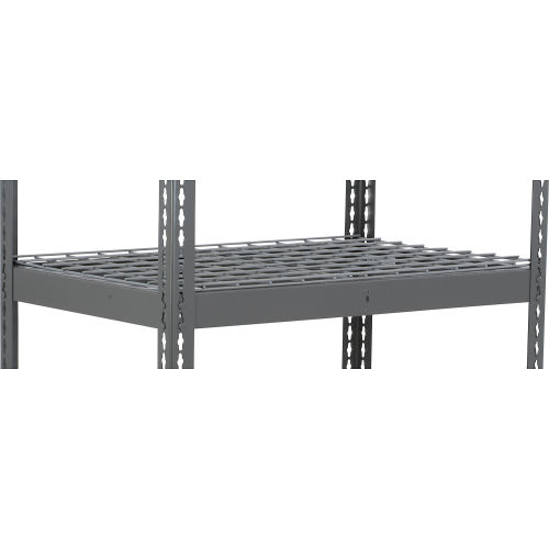 ✓ Max storage weight of 1500 lbs. per level ✓ Durable and adaptable storage for retail industrial and commercial spaces ✓ Open shelves are adjustable at 1 " increments ✓ Easy assemblyno bolts, nuts, or clips required The Global Industrial Extra Heavy Duty Boltless Shelving Additional Shelf with Wire Decking is designed to maximize your storage area. For use in retail, commercial, and industrial applications. Open design allows four side access providing maximum flexibility. Easily add an additional level with snap-in components. No nuts, bolts, or clips required. Sturdy roll-formed steel framing provides maximum support. Front-to-back supports help prevent beams from rotating when fully loaded. Double Rivet button stud construction locks perimeter beams into corner post forming a structurally secure joint, eliminating back and side sway. Chip resistant Gray baked enamel finish. Wire decking allows ventilation, visibility and light penetration. Sprinkler water passes throughout racks easily, improving fire safety and lowering insurance premiums.