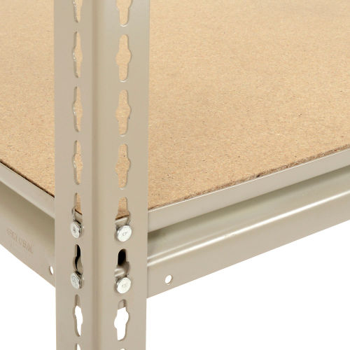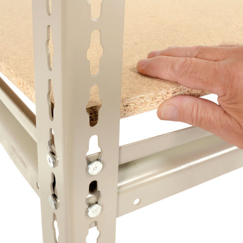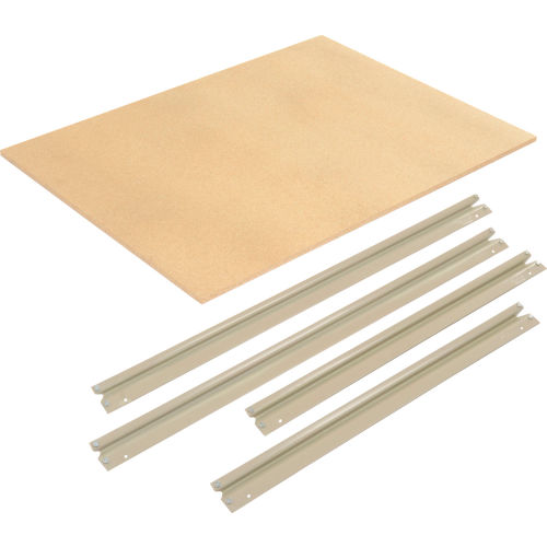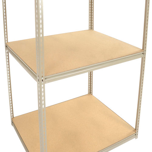 High Capacity Boltless Rack With Wood Decking - Additional Level This 48"W x 24"D shelf can be added to existing rack. Made of precut 5/8" particleboard, an economical choice for decking. Tan baked enamel finish. Includes 4 beams. 1500 lb. shelf capacity.