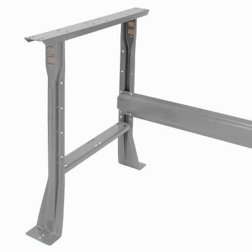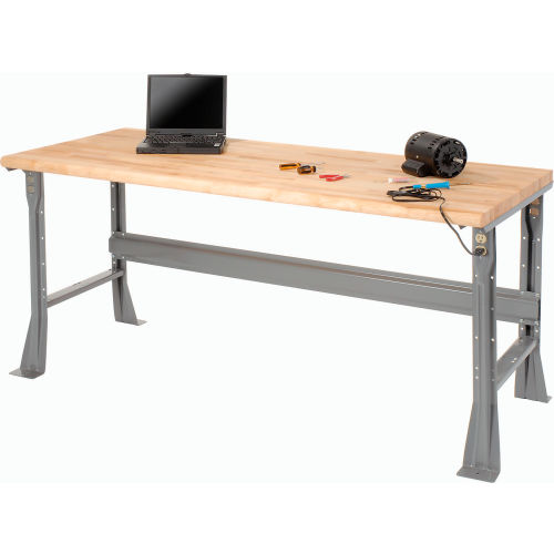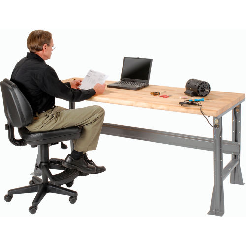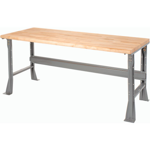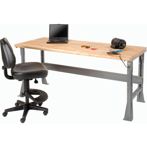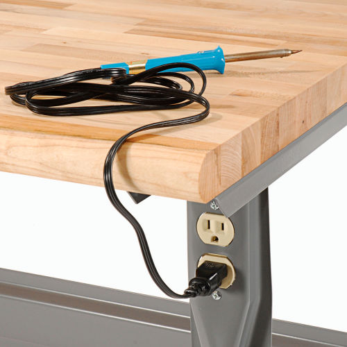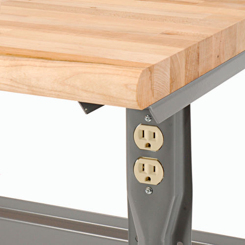 ✓ Rounded, safety-edge maple Boos butcher block by John Boos & Co. ✓ High weight capacity to handle most projects and tasks ✓ Flared legs for added stability This workbench is built to withstand years of heavy duty use. The ergonomically designed safety edge rolled front has no hard edge to damage parts or dig in when you lean against the bench. The legs feature double electrical knockouts and all-welded channel construction. The workbench is finished with scratch-resistant gray powder coat. The 1-3/4" thick maple butcher block top bench provides quality that is functional and attractive. Its solid grain hardwood top is kiln dried, electronically cured and sealed with a mineral oil protectant to create a smooth, strong surface that can take continual pounding and use. The bench stringer comes with mounting hardware to assemble legs to the bench top.