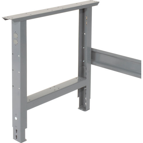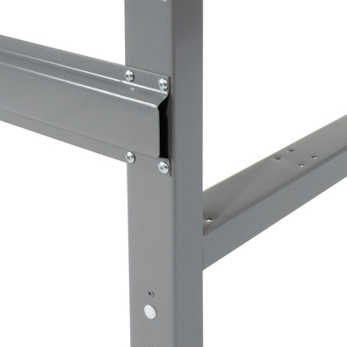 Each high quality, heavy-duty bench is built to give you years of dependable performance. Adjustable height legs feature removable duplex knockouts on front and rear for installation of either a hard wired electrical outlet or an optional plug-in outlet that easily screws into place with no wiring necessary. All steel parts are specially treated to resist rust and finished with durable gray powder coat. Built for rugged use, yet is still easy to keep clean. 1-5/8" thick high pressure plastic laminate-faced particle board core top gives you a smooth, rigid work surface that lasts and lasts. Bench stringer comes with mounting hardware to assemble legs to the bench top. Leg height adjusts in 1-1/2" increments.