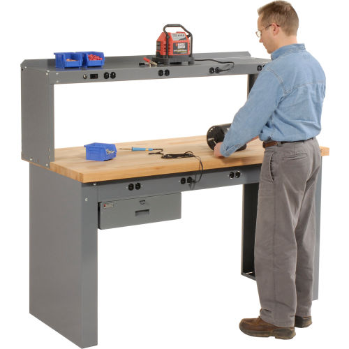 ✓ Square-edge maple Boos butcher block by John Boos & Co. ✓ High weight capacity to handle most projects and tasks ✓ Panel legs with power apron This workbench features a maple butcher block square edge top that is ideal for applications where heavy loading and extreme surface abuse occurs. This self-contained electronic workbench offers unequaled versatility and economy for precision fabricating and assembly work. It is designed for labs, cleaning stations, electronic assemblers, technicians, etc. An optional bench riser with power center adds storage space, keeps work surface clear and uncluttered, and puts electrical power at your fingertips. The optional sliding drawer is lockable and handy for tools, supplies and other small items. The panel legs provide rigid stability. This workbench is easy to assemble. This workbench is shown with an optional power riser and drawer.
