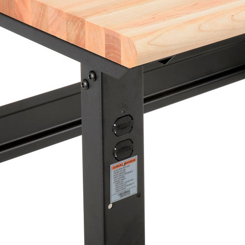 ✓ Rounded, safety-edge maple Boos butcher block by John Boos & Co. ✓ High weight capacity to handle most projects and tasks ✓ Adjustable-height C-channel legs One of the toughest industrial tops you'll find anywhere. Global's 1-3/4" Maple butcher block provides a durable work surface. Electronically cured maple bench top is kiln dried, sanded smooth and finished with a penetrating oil protectant. Rounded front safety edge protects workers from leaning against sharp edges. Tops must be oiled on all surfaces every 1-2 weeks depending on use or conditions for up keep. Adjustable height legs feature removable duplex knockouts on front and rear for installation of either a hard wired electrical outlet or an optional plug-in outlet that easily screws into place with no wiring necessary. Steel parts are undercoated to resist rust and finished with black powder coat for durability. Bench stringer comes with mounting hardware to assemble legs to the bench top. Leg height adjusts in 1-1/2" increments.