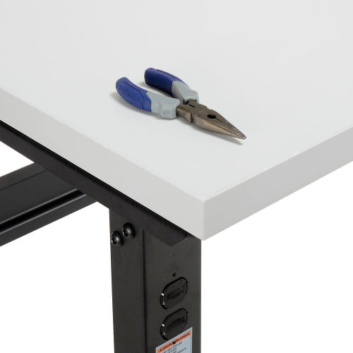 Each high quality, heavy-duty bench is built to give you years of dependable performance. Adjustable height legs feature removable duplex knockouts on front and rear for installation of either a hard wired electrical outlet or an optional plug-in outlet that easily screws into place with no wiring necessary. All steel parts are specially treated to resist rust and finished with black powder coat. Built for rugged use, yet is still easy to keep clean. 1-5/8" thick high pressure plastic laminate-faced particle board core top gives you a smooth, rigid work surface that lasts and lasts. Bench stringer comes with mounting hardware to assemble legs to the bench top. Leg height adjusts in 1-1/2" increments.