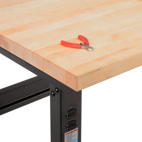 ✓ Square-edge maple Boos butcher block by John Boos & Co. ✓ High weight capacity to handle most projects and tasks ✓ Adjustable-height, C-channel legs 96"W x 36"D Adjustable Height Workbench C-Channel Leg - Maple Butcher Block Square Edge - Black A workman's dream bench. This solid, rugged top stands up to constant, heavy pounding. Hardwood is kiln dried, electronically glued, sanded to 1-3/4" thickness and has laminated edges. Finished with a penetrating mineral oil for a durable high quality appearance. 96"L benches include 3 leg frames for stability and reinforcement. Adjustable height legs feature removable duplex knockouts on front and rear for installation of either a hard wired electrical outlet or an optional plug-in outlet that easily screws into place with no wiring necessary. Steel parts are finished with scratch resistant black powder coat. Bench stringer comes with mounting hardware to assemble legs to the bench top. Leg height adjusts in 1-1/2" increments.