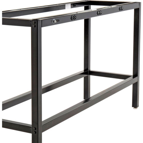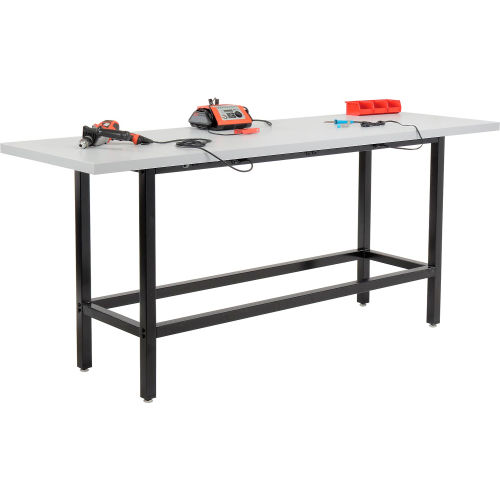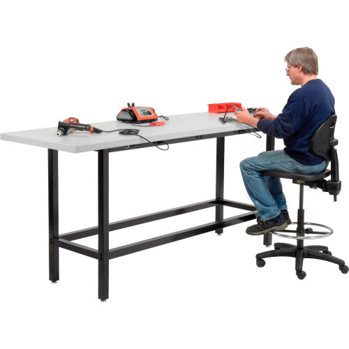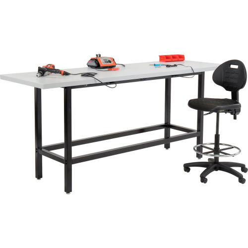 This standing height workbench adds flexibility to your work area. The workbench is at a comfortable and ergonomic height for most workers and can be used with adjustable height workbench chairs for a healthy sit-stand workstation. The 1-5/8" thick high pressure plastic laminate-faced particle board core top gives you a smooth, easy to clean work surface. This bench is equipped with 6-115V duplex outlets on each side for convenient access to power for tools and computers.