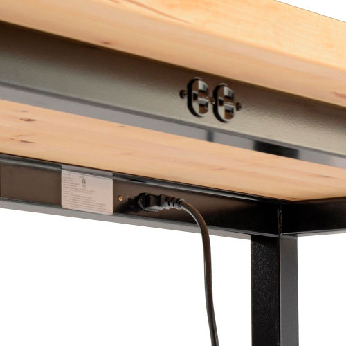 This standing height workbench adds flexibility to your work area. The workbench is at a comfortable and ergonomic height for most workers and can be used with adjustable height workbench chairs for a healthy sit-stand workstation. The 1-5/8" thick high pressure plastic laminate-faced particle board core top gives you a smooth, easy to clean work surface. This bench is equipped with 6-115V duplex outlets on each side for convenient access to power for tools and computers.