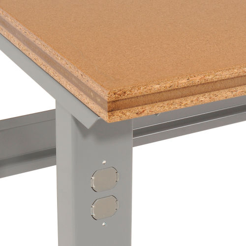 One of the toughest industrial tops you'll find anywhere. Global's 1-1/2" Shop Top provides a smooth, extra-strong, non-conductive work surface. Durable tempered hardboard bonded to a particleboard core built to withstand rugged treatment. Smooth hardwood edges resist moisture and won't warp or splinter. Adjustable height legs feature removable duplex knockouts on front and rear for installation of either a hard wired electrical outlet or an optional plug-in outlet that easily screws into place with no wiring necessary. Steel parts are gray powder coated. Bench stringer comes with mounting hardware to assemble legs to the bench top. Leg height adjusts in 1-1/2" increments.