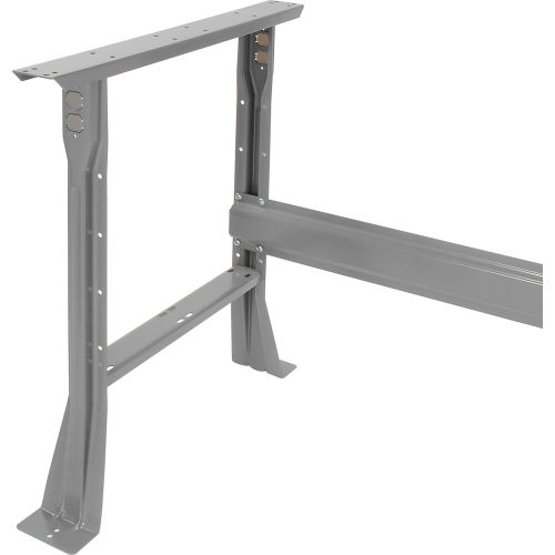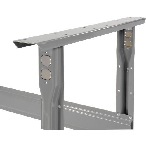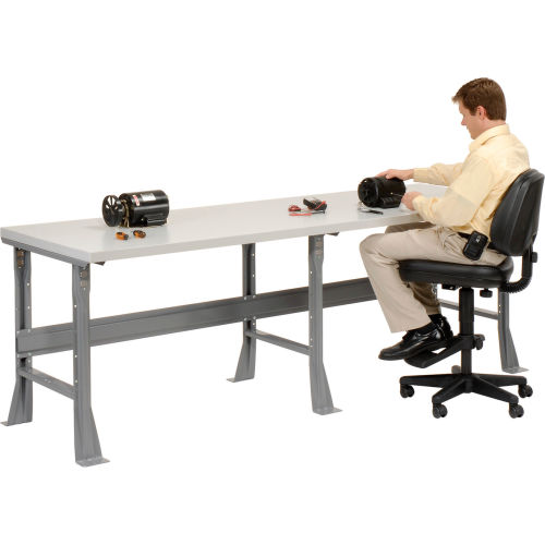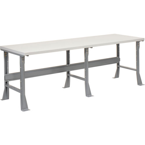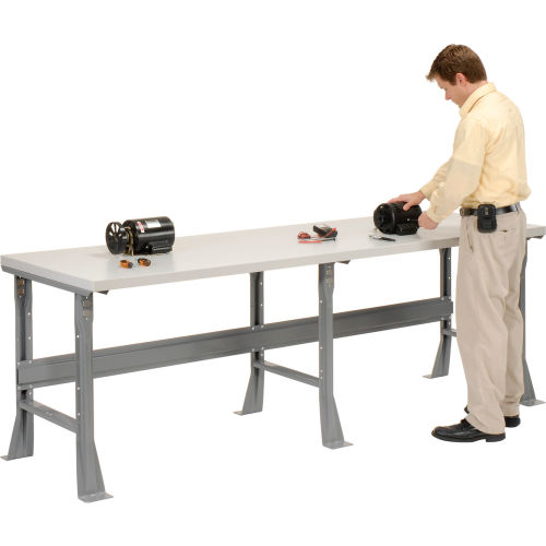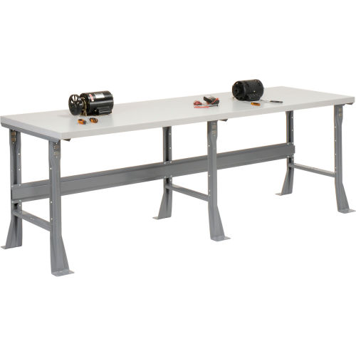 This heavy duty workbench is built to give years of dependable performance. The fixed flared leg workbench has two electrical knockouts located in each 3" wide leg. All welded channel steel legs and all steel parts are specially treated to resist rust and finished with a durable gray powder coat. The 96"L workbench includes 3 leg frames for stability and reinforcement. The workbench is built for rugged use, yet it is easy to keep clean. The 1-5/8" thick high-pressure plastic laminate-faced particle board core top gives you a smooth, rigid work surface that lasts and lasts. The bench stringer comes with mounting hardware to assemble legs to the benchtop.
