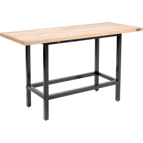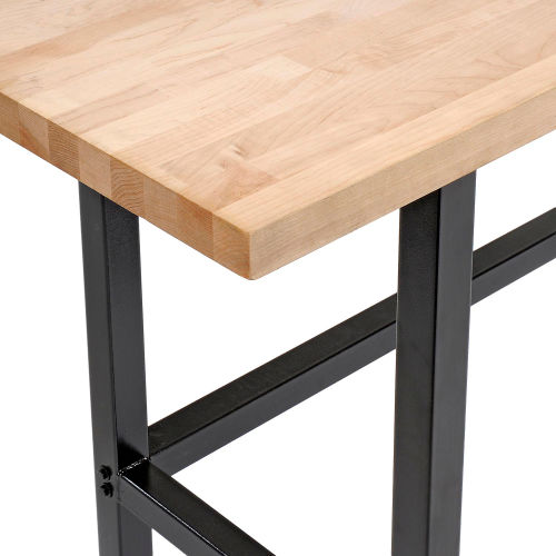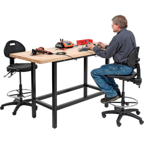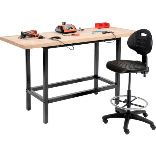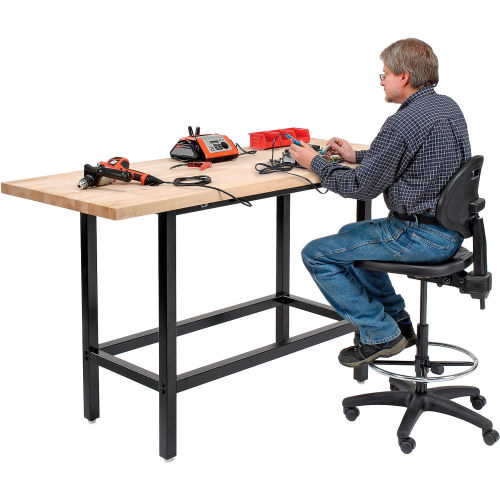Standing Height Workbench, Maple Butcher Block Square Edge Black 72"W x 30"D Standing height workbenches add flexibility to your work area. These benches are at a comfortable and ergonomic height for most workers and can be used with adjustable height workbench chairs for a healthy sit-stand workstation. Maple butcher block top provides a durable worksurface for heavy duty applications. This bench is equipped with 4-115V duplex outlets on each side for convenient access to power for tools and computers.