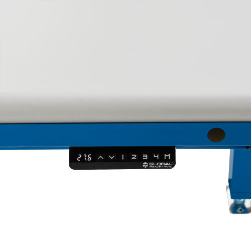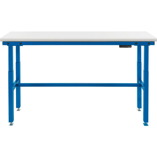 ✓ Rugged Heavy-Duty tubular steel 4-leg frame adjusts from 28" to 40" in height ✓ Includes programmable heights & easy push-button control ✓ Easy ergonomic adjustment to fit the workers best workable height Improve circulation and help reduce fatigue with the Global Industrial Electric Adjustable-Height Workbench. The tubular 4-leg frame design adjusts from 28" to 40" in height allowing users to choose whether they want to sit or stand during their workday, or just reach the workable height custom to them. The 24V DC motor adjusts height at 6cm/sec or 2.3+"/sec, allowing to reach your required work height easy and efficiently. Ideal for repair and assembly areas with multiple shifts, this workbench, with high pressure plastic laminate top over particle board for a clean look surface, minimizes bending and stretching unnecessarily while the safety edge design helps prevents bodily injury. Surface measurements: 72" x 30". UL and CSA certified. 1-Year Limited Warranty. Frame color: Blue Weight capacity: 1000 lbs. Table top thickness: 1-5/8".