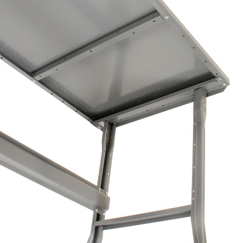 This workbench has a 12 ga steel top reinforced with 14 ga end channels for superior strength and durability. Scratch resistant powder coat finish will not absorb oil and resists rust and cracks. Its 1-1/2" thick steel top comes with mounting hardware to attach the top to the legs.