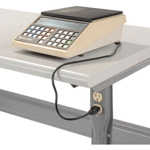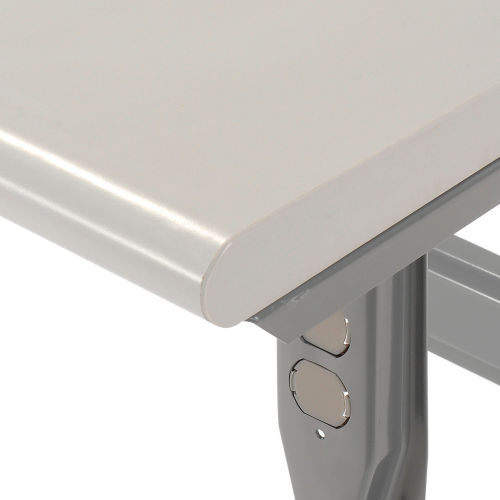 This workbench is built to withstand years of heavy duty use. The ergonomically designed safety edge rolled front has no hard edge to damage parts or dig in when you lean against the bench. The legs feature double electrical knockouts and all-welded channel construction. The workbench is finished with scratch-resistant gray powder coat. The white, antistatic 1-1/4" thick top dissipates 5000 V static charge in 0.01 sec with a surface resistance of 1010 . This workbench is easy to clean. The bench stringer comes with mounting hardware to assemble legs to the bench top.