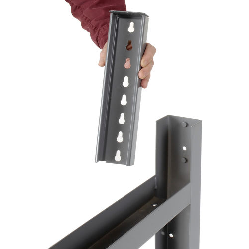Plastic Laminate Square Edge Work Bench Adjustable Height 1-5/8" Top Gray 48"W X 30"D PLASTIC TOP WORKBENCHES Each high quality, heavy-duty bench is built to give you years of dependable performance. Built for rugged use, yet is still easy to keep clean. 1 5/8 thick high pressure plastic laminate-faced particle board core top gives you a smooth, rigid work surface that lasts and lasts. Bench height adjusts 29 to 36-5/8H in 1-1/2 increments.All steel parts are specially treated to resist rust and finished with gray powder coat. Adjustable height legs feature removable duplex knockouts on front and rear for installation of either a hard wired electrical outlet or an optional plug-in outlet that easily screws into place with no wiring necessary.