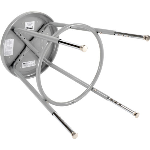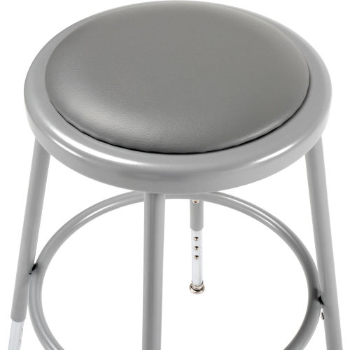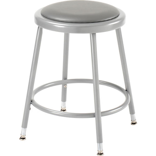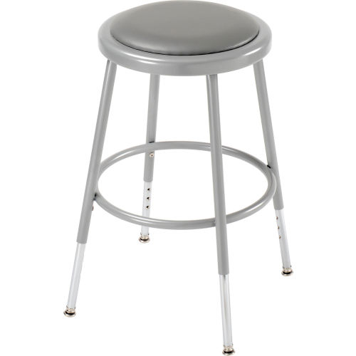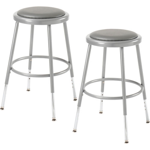Interion Steel Shop Stool with Vinyl Padded Seat and Adjustable Legs The durable construction and classic design of these heavy-duty stools from Interion By Global Industrial are ideal for hands-on settings like art rooms, science labs, home economics or shop classrooms. These reliable stools feature a sturdy frame of 18-gauge steel tubing securely welded to a 14" diameter seat pan. Riveted through the steel pan is 1/2"-thick gray vinyl cushioning that will provide years of dependable use. Footrest rings are securely bonded to each leg with four spotwell contact points. Adjustable height legs feature self-leveling glides and adjust in 1" increments up to 8 additional inches. Height Range 27"H. 2 stools per pack. Add Accessories: Padded Backrest: B2056745.