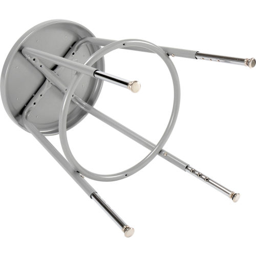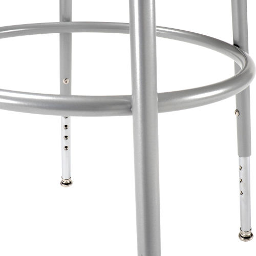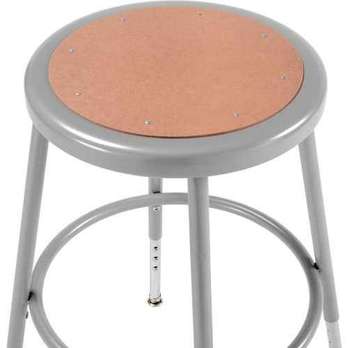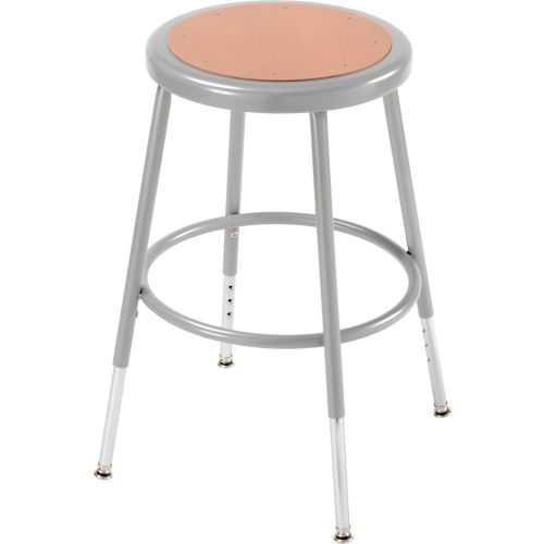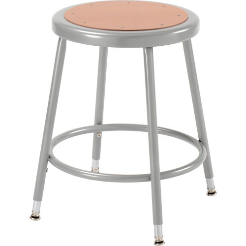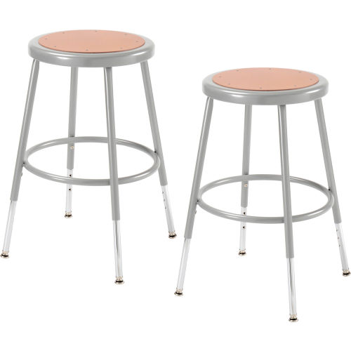 Interion Steel Shop Stool with Round Hardboard Seat and Adjustable Legs The durable construction and classic design of these heavy-duty stools from Interion By Global Industrial are ideal for hands-on settings like art rooms, science labs, home economics or shop classrooms. These reliable stools feature a sturdy frame of 18-gauge steel tubing securely welded to a 14" diameter seat pan. Riveted to the pan are firm, round Masonite seats that will not warp, chip or crack as they provide years of dependable use. Footrest rings are securely bonded to each leg with four spotwell contact points. Adjustable height legs feature self-leveling glides and adjust in 1" increments up to 8 additional inches. Height Range - 19" - 27"H. 2 stools per pack. Add accessories: Backrest: B2056744.