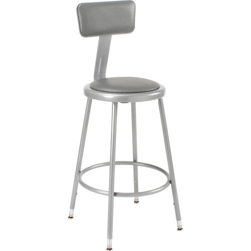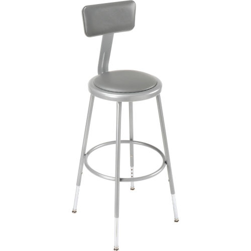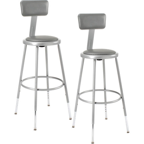Interion Steel Shop Stool with Vinyl Padded Seat, Backrest and Adjustable Legs The durable construction and classic design of these heavy-duty stools from Interion By Global Industrial are ideal for hands-on settings like art rooms, science labs, home economics or shop classrooms. These reliable stools feature a sturdy frame of 18-gauge steel tubing securely welded to a 14" diameter seat pan. Riveted through the steel pan is 1/2"-thick vinyl cushioning that will provide years of dependable use. Footrest rings are securely bonded to each leg with four spotwell contact points. Adjustable height legs feature self-leveling glides and adjust in 1" increments up to 8 additional inches. Height Range - 25" - 35"H. Padded backrest measures 6"H x 12"W and adjusts up/down and forward/back. 2 stools per pack.