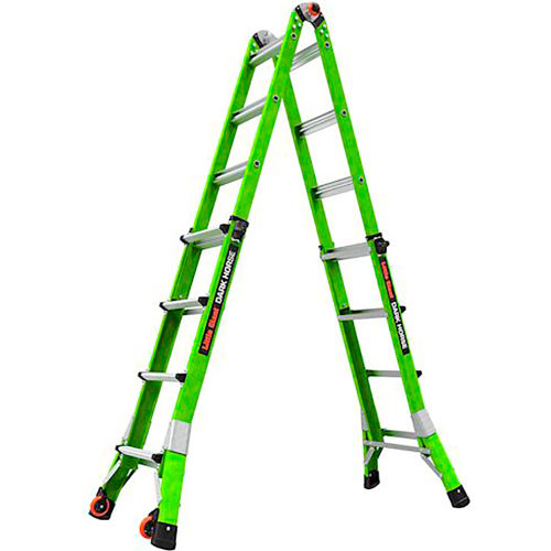 The Little Giant Dark Horse combines some of our best ladder features into one versatile multi-position ladder that will suit your ladder needs for years to come. Multi-Position The best part about the Little Giant multi-position ladders is that it accomplishes multiple tasks with one ladder. Set up the Dark Horse in A-frame, extension, 90-degree, staircase and trestle-and-plank* positions, for a versatile, easy climbing experience. Ratchet Levelers Not every worksite has level ground. With the optional Ratchet levelers, you can ensure that your ladder is stable before you start climbing. Non-Conductive Fiberglass Ladder with Side-Tip Stability Made from durable, non-conductive fiberglass, this ladder is ideal for most jobs. It also features a wide-flared base for increased side-tip stability to prevent falls from accidental overreaching. Other Benefits The Dark Horse meets or exceeds all OSHA and ANSI standards. It is available as a IA 300 lb. rated ladder, and it is also available as a 13' IAA ladder rated to hold 375 lbs. *Plank not included.
