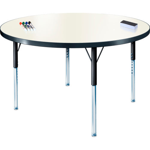 HEIGHT ADJUSTABLE MARKERBOARD ACTIVITY TABLES Diameter Round Table - Juvenile Height Adjustment Range These activity tables feature a markerboard work surface that is perfect for classrooms and easy to clean. Activity tables feature a 1-1/8" thick high pressure laminate table top with a dry-erase markerboard surface for easy wipe on / wipe off marker use. Table top has black vinyl T-mold edging for safety. Ideal for guided groups and small classrooms. Particleboard top is covered with high pressure, dry-erase white laminate that is scratch, stain and mar resistant. Easy assembly. All Products are Made to Order and Made in the USA.