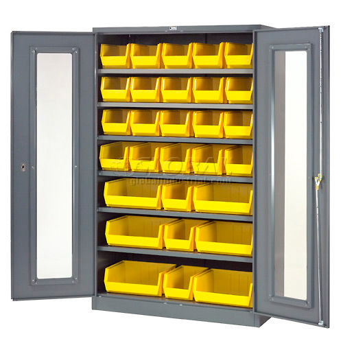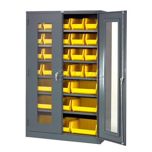 Locking Bin Cabinet with Clear Window Dust Free, Secure and Organized Storage Storage cabinet features reinforced doors that open a full 180° for complete access and close with a three-point locking system and key lock. Features break resistant acrylic windows for easy viewing. Break resistant polypropylene plastic bins have generous hopper openings offer easy viewing and access. Bins fit efficiently on heavy-gauge steel adjustable shelves. Powder coat exterior finish. Assembled cabinets are not returnable.Cabinet measures 48"W x 24"D x 78"H. Image shows the 48"W x 24"D x 78"H cabinet with 20 bins. Customize your storage with additional bins.