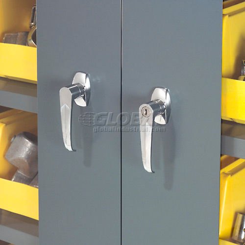 Locking Storage Cabinet Clear Door 48x24x78 With 29 Yellow Stacking Bins and 6 Shelves Unassembled Dust Free, Secure and Organized Storage Storage cabinet features reinforced doors that open a full 180° for complete access and close with a three-point locking system and key lock. Features break resistant acrylic windows for easy viewing. Break resistant polypropylene plastic bins have generous hopper openings offer easy viewing and access. Bins fit efficiently on heavy-gauge steel adjustable shelves. Powder coat exterior finish. Cabinet measures 48"W x 24"D x 78"H. Image shows the 48"W x 24"D x 78"H cabinet with 20 bins. Customize your storage with additional bins.