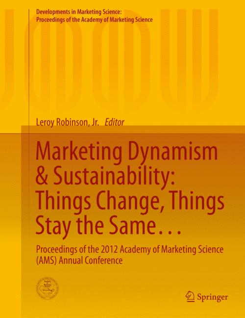 Founded in 1971, the Academy of Marketing Science is an international organization dedicated to promoting timely explorations of phenomena related to the science of marketing in theory, research, and practice. Among its services to members and the community at large, the Academy offers conferences, congresses and symposia that attract delegates from around the world. Presentations from these events are published in this Proceedings series, which offers a comprehensive archive of volumes reflecting the evolution of the field. Volumes deliver cutting-edge research and insights, complimenting the Academys flagship journals, the Journal of the Academy of Marketing Science (JAMS) and AMS Review. Volumes are edited by leading scholars and practitioners across a wide range of subject areas in marketing science. This volume includes the full proceedings from the 2012 Academy of Marketing Science (AMS) Annual Conference held in New Orleans, Louisiana, entitled Marketing Dynamism & Sustainability: Things Change, Things Stay the Same.