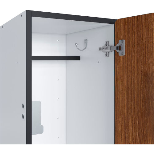 ✓ Electronic vertical keypad lock ✓ Carb II-compliant particleboard covered in durable laminate ✓ Durable and moisture-resistant steel base Elevate the look & feel of your locker room or changing room with this unassembled 3-tier/3-door Global Industrial Digital Wood Locker. Wood lockers give any space a natural warmth that presents a more comfortable and welcoming tone than standard metal lockers plus they are also quieter when they close. The body of the locker is made of 0.70" (18mm) thick Carb II-compliant particleboard covered in a durable high-pressure laminate with heavy-duty concealed steel hinges, and a digital electronic keypad. This vertical keypad lock is easily programmable and can be used in either Public mode for single-use passcodes or Private mode for longer-term individual use. What separates this Global Industrial wood locker from the competition is the durable, moisture-resistant steel base. Typical wood lockers carry the wood to the base, which can warp, peel, or buckle when exposed to persistent moisture such as gym or club locker rooms and spas. The steel base on this locker is designed to deliver elegant performance with a long service life. This version comes unassembled in a cherry wood color. Includes one battery and one master key per lock Door edges are banded with PVC banding Locker doors are 12.0" wide x 0.70" deep Blank steel ID plates included for customization Each compartment includes a 4-5/8" deep shelf and two sets of double prong hooks Optional color-matched cherry wood end panel, #290629 available separately, to present a finished look Ideal for use in: Clubhouses & country clubs, spas & resorts, fitness centers & gyms, executive suites.