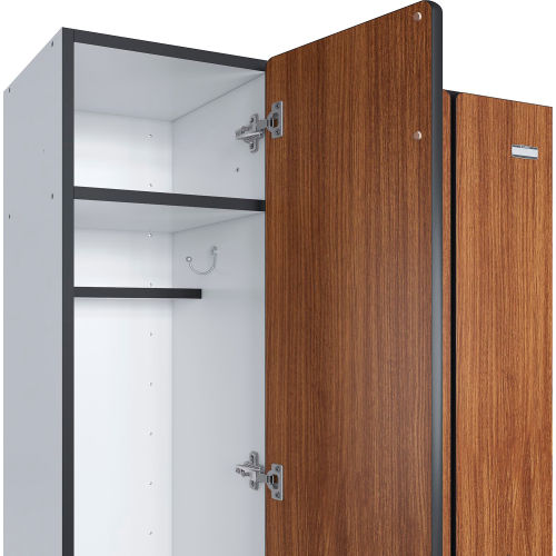 ✓ Electronic vertical keypad lock ✓ Carb II-compliant particleboard covered in durable laminate ✓ Durable and moisture-resistant steel base Elevate the look & feel of your locker room or changing room with this fully assembled 1-tier/3-door Global Industrial Digital Wood Locker. Wood lockers give any space a natural warmth that presents a more comfortable and welcoming tone than standard metal lockers plus they are also quieter when they close. The body of the locker is made of 0.70" (18mm) thick Carb II-compliant particleboard covered in a durable high-pressure laminate with heavy-duty concealed steel hinges, and a digital electronic keypad. This vertical keypad lock is easily programmable and can be used in either Public mode for single-use passcodes or Private mode for longer-term individual use. What separates this Global Industrial wood locker from the competition is the durable, moisture-resistant steel base. Typical wood lockers carry the wood to the base, which can warp, peel, or buckle when exposed to persistent moisture such as gym or club locker rooms and spas. The steel base on this locker is designed to deliver elegant performance with a long service life. This version comes fully assembled in a cherry wood color. Includes one battery and one master key per lock Door edges are banded with PVC banding Locker doors are 12.0" wide x 0.70" deep Blank steel ID plates included for customization Each compartment includes a 4-5/8" deep shelf and two sets of double prong hooks Optional color-matched cherry wood end panel, #290629 available separately, to present a finished look Ideal for use in: Clubhouses & country clubs, spas & resorts, fitness centers & gyms, executive suites.