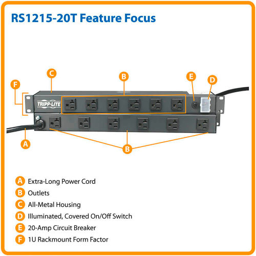 Tripp Lite's RS-1215-20T Power Strip offers 20A capacity AC power distribution in a versatile multi-mount cabinet. Detachable mounting flanges are configurable for rackmount, wall mount and under-counter installation. Uses only 1 rack space (1U) when installed in any 19-in. rack meeting EIA standards. Unfiltered electrical pass-through makes RS-1215-20T ideal for distributing alternate waveform UPS or generator power in rack enclosures, network closets and more. Includes 12 NEMA5-15/20R outlets (6 front/6 rear), 15-ft. AC power cord with locking NEMA L5-20P input plug and lighted switch with cover that prevents risk of accidental turn-off. Supports 19-in. rackmount (uses 1 rack space/1U), wall mount, under-counter and more.