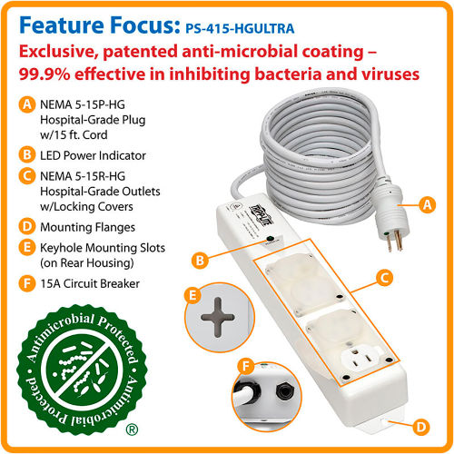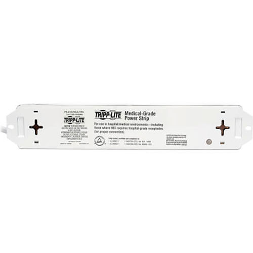 Offering 15A AC power distribution for 120V applications in a rugged all-metal case. Tripp Lite's PS-415-HGULTRA has full 60601-1 compliance, integrated locking safety covers and a 15 ft. cord make this medical-grade power strip ideal for all areas inside and outside of patient care vicinities.. Featuring unique, patent-pending internal site-wiring fault protection, it resets automatically with no need for action by the user. Features include switchless design to prevent accidental shutoff, NEMA 5-15PHG hospital-grade plug, 15A resettable circuit breaker, and optional-use keyhole mounting slots and flanges.