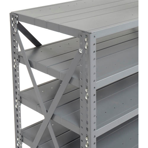 Steel Open Shelving 6 Shelves No Bin - 36x12x39 - 239600 STEEL SHELVING Open Shelving Style OPEN style shelving has anti-sway braces on the back and the sides for added stability. Easy to assemble rugged steel shelving with long-lasting gray baked enamel finish.