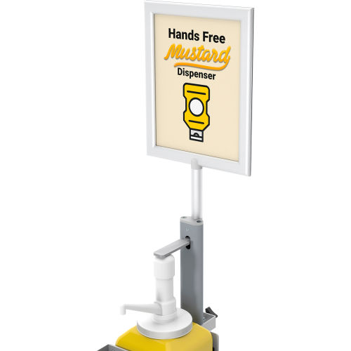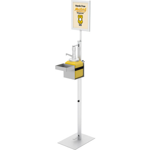 ✓ Adjustable in height. ✓ Foot pedal dispenses condiment with ease. ✓ Accommodates bottles of various heights and designs. Upgrade your public dining area with the Global Industrial Touch Free Condiment Dispenser. Equipped with a removable drip tray for easy cleanup and a promotional sign for high visibility, this dispenser offers a convenient, hands-free solution for indoor stadiums, fast food restaurants, cafeterias, and hospitality establishments. Its all metal construction and heavy-duty steel base are built to last, with a Velcro hook and loop fastener that keeps condiment bottles securely in place. Compatible with the translucent condiment dispenser model #412215. Made in the USA. 1 Year Limited Warranty. Measures (with frame): 14" L x 10" W x 63" H. Drip tray is removable; no tools needed. Holds pump bottles up to 6" W x 6" D. Assembly required. Dispenser weighs 21 lbs. Graphic not included.