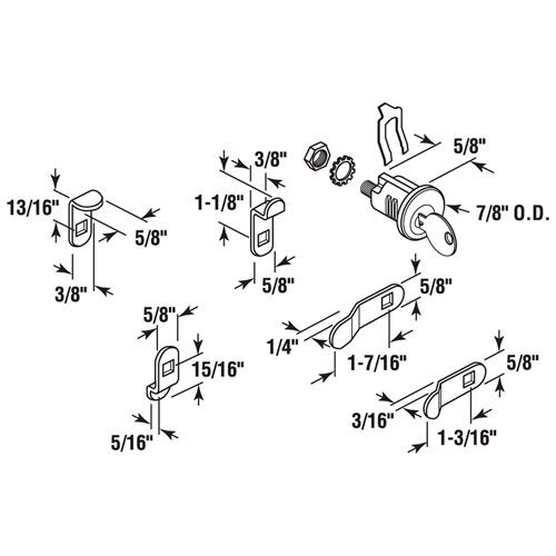 Diecast cylinder with brass plated face, brass pins and spring steel locking clip. Replaces many manufacturers original equipment product. Rotates 90 degrees counter clockwise to open. Replaces American Device, Auth-Florence, Miami-Carey, and Bommer. Locks are keyed diffferently. Keyed alike locks available, call for information.