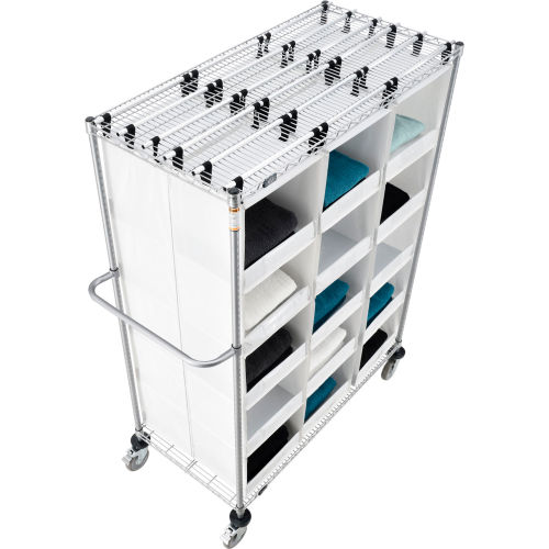 Whether transporting items on the road, or having them standing flat on the stockroom or warehouse floor, the Nexel 24"x48"x63", Back To Back, 30 Cells truck remains upright and rigid while keeping your inventory stationary, organized, and within convenient reach. This top choice storage truck is ideal for warehouses, fulfillment centers, other manufacturing facilities looking for a mobile solution with 30 back-to-back cells that that mobilize your picking process with a flexible, mobile solution for inventory counts, putaway, or picking. Wire Stock Picking truck has 30 back-to-back cells that mobilize your picking process with a flexible, mobile solution for inventory counts, putaway or picking. Nexelate wire trucks are made from durable wire that has an attractive silver epoxy powder-coated finish over a rust inhabiting undercoat. NSF approved for wet or dry use. Units include 4 posts, 2 shelves for top and base, plastic shelf clips, tie-bar and Polyurethane Casters, 2 Swivel with Brakes, 2 Rigid. Trucks feature 5" stem casters with tie bar giving you a 1200 lb overall truck load capacity, each vinyl cell compartment capacity of 35lbs. Hanging compartments cells are constructed of lightweight 13oz Vinyl/HRF that attach to Aluminum hanging rods with loops on the top of your compartment cells, designed for years of low-maintenance & demanding warehouse environment use. Overall size 24"D x 48"W x63"H. Cells are 13.5"W x 11.5"D x 11"H.