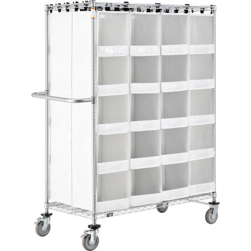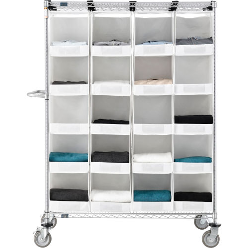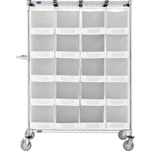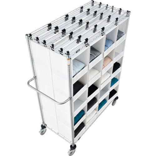 Whether transporting items on the road, or having them standing flat on the stockroom or warehouse floor, the Nexel 24"x48"x63", Back To Back Wire Stock Picking truck remains upright and rigid while keeping your inventory stationary, organized, and within convenient reach. This top choice storage truck is ideal for warehouses, fulfillment centers, other manufacturing facilities looking for a mobile solution with 40 back-to-back cells that that mobilize your picking process with a flexible, mobile solution for inventory counts, putaway, or picking. Nexelate wire trucks are made from durable wire that has an attractive silver epoxy powder-coated finish over a rust inhabiting undercoat. NSF approved for wet or dry use. Units include 4 posts, 2 shelves for top and base, plastic shelf clips, tie-bar and Polyurethane Casters, 2 Swivel with Brakes, 2 Rigid. Trucks feature 5" stem casters with tie bar giving you a 1200 lb overall truck load capacity, each vinyl cell compartment capacity of 35lbs. Hanging compartments cells are constructed of lightweight 13oz Vinyl/HRF that attach to Aluminum hanging rods with loops on the top of your compartment cells, designed for years of low-maintenance & demanding warehouse environment use. Overall size 24"D x 48"W x63"H. Cells are 10.5"W x 11.5"D x 11"H.