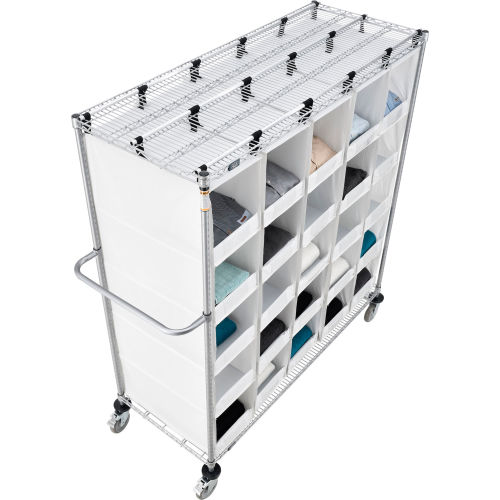 Ideal for warehouses, fulfillment centers, manufacturing facilities and more, Nexel Wire Stock Picking trucks offer a mobile solution for inventory counts, put-away or picking. Modular picking trucks features 20 cells measuring 10-1/2"Wx23-1/2"Dx11"H, capable of holding 35 Lbs. per cell. Hanging compartment cells are constructed of lightweight 13 oz. vinyl/HRF that attach to aluminum hanging rods with loops on the top of your compartment cells, designed for years of low-maintenance & demanding warehouse environment use. Nexelate wire trucks have a silver epoxy powder-coated finish over a rust inhabiting undercoat and are NSF approved for wet or dry use. Units include 4 posts, 2 shelves (top and base), plastic shelf clips, push handle, tie-bar and polyurethane casters (2 swivel with brakes, 2 rigid). The 5" stem casters provide a 1200 lb overall truck load capacity. Overall size 24"Wx60Lx"69"H.