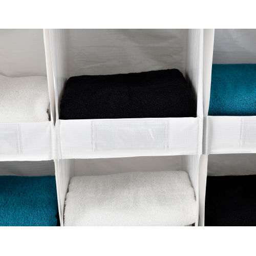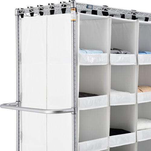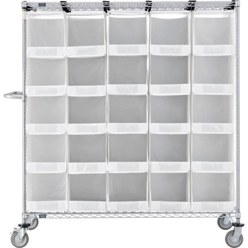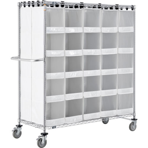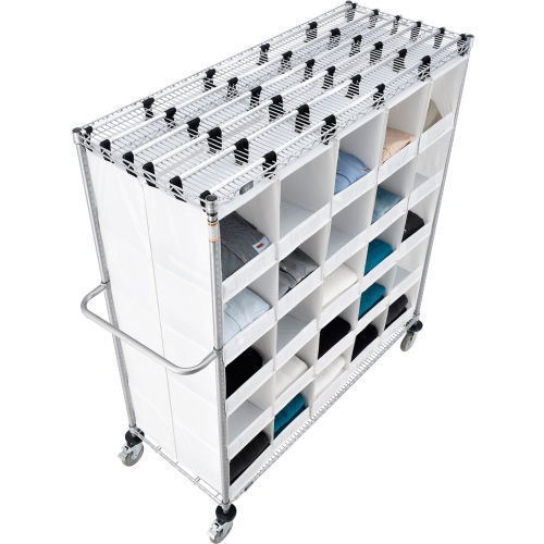 Whether transporting items on the road, or having them standing flat on the stockroom or warehouse floor, the Nexel 24"x60"x63", Back To Back, 50 Cells Truck remains upright and rigid while keeping your inventory stationary, organized, and within convenient reach. This top choice storage truck is ideal for warehouses, fulfillment centers, other manufacturing facilities looking for a mobile solution with 50 back-to-back cells that that mobilize your picking process with a flexible, mobile solution for inventory counts, putaway, or picking. Nexelate wire trucks are made from durable wire that has an attractive silver epoxy powder-coated finish over a rust inhabiting undercoat. NSF approved for wet or dry use. Units include 4 posts, 2 shelves for top and base, plastic shelf clips, tie-bar and Polyurethane Casters, 2 Swivel with Brakes, 2 Rigid. Trucks feature 5" stem casters with tie bar giving you a 1200 lb overall truck load capacity, each vinyl cell compartment capacity of 35lbs. Hanging compartments cells are constructed of lightweight 13oz Vinyl/HRF that attach to Aluminum hanging rods with loops on the top of your compartment cells, designed for years of low-maintenance & demanding warehouse environment use. Overall size 24"D x 60"W x63"H. Cells are 10.5"W x 11.5"D x 11"H.