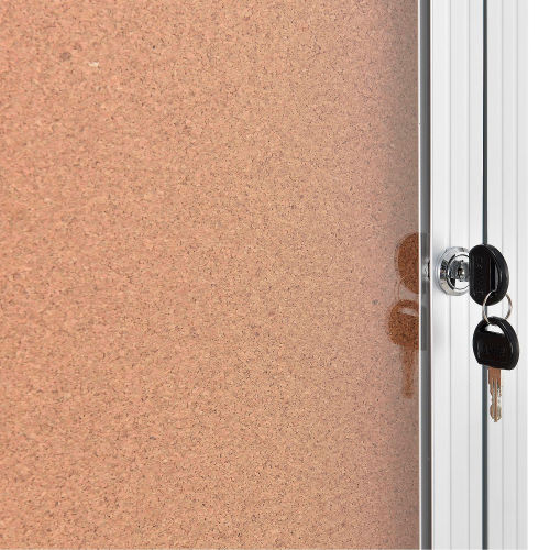 Self-healing cork surface with particle board back. Full-length door hinges. Shatter-resistant acrylic window. Lockable door with keys. Hardware Included. 1 Year Warranty.