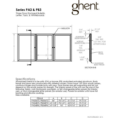 Ghent 3 Door Enclosed Vinyl Bulletin Board, Ocean w/Silver Frame, 96"W x 48"H Ghent's Enclosed Vinyl Bulletin Board is the perfect way to display messages, pictures, and important information securely. The message center is made with a vinyl tack surface that hides pin holes and holds up under repeated taking, providing years of reliable service. When used outside our vinyl board will not break down or mold, unlike cork enclosed boards. You do not have to worry about damage from weather or humidity as long as you hang the board under an awning or overhang. Ghent's 3-door enclosed bulletin boards are protected using shatter-proof acrylic panels, full-length door hinges, and locks that are flush with the frame. You can install the board in high-traffic, public areas without worrying about damage or tampering. Hidden corner brackets allow the message center to sit flush against the wall without any visible hardware, which adds protection from vandalism. The colored vinyl surface is paired with a Satin aluminum frame and includes 2 keys. Ships to you in Ghent's worry-free packaging, designed specifically for shipping enclosed boards. Ghent's Enclosed Vinyl Bulletin Board carries a 10-year warranty and is made in the USA. Perfect for indoor and outdoor use. FeaturesConcealed corner brackets allow for easy and secure mountingWeather-resistant durability with self-healing vinyl tack surfaceFlush mount locks and shatter-resistant acrylic panels for added securityCarries a 10-year manufacturer warrantyMade in the USA.