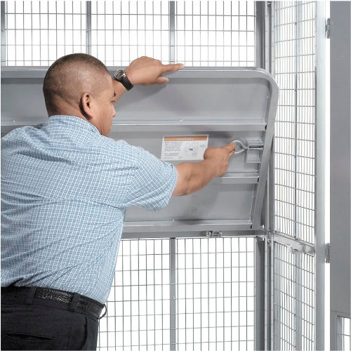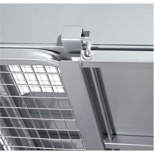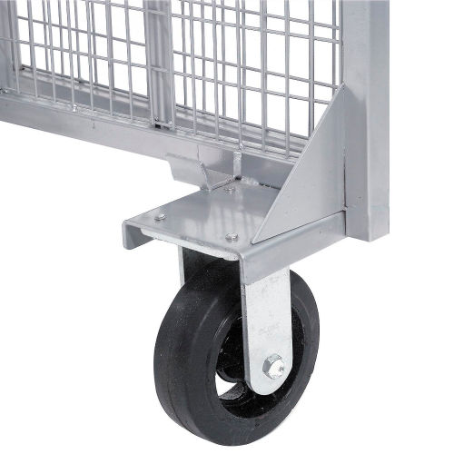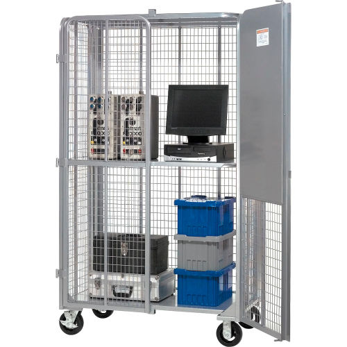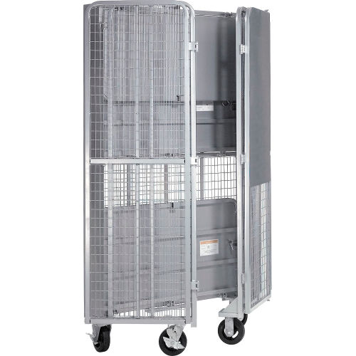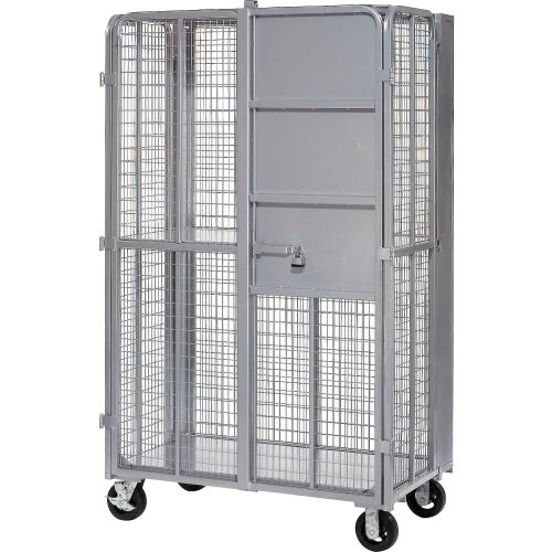 Folding Security Truck 44-1/2"W x 27"D x 76"H 2000 Lb. Capacity - 912114 Folding truck conserves valuable floor space, as it folds to only 6" thick when not in use. Completely encloses all types of merchandise and lockable for maximum security. Constructed of 1" square tubing and heavy gauge 1" x 2" wire mesh. Top, bottom deck and center shelf are 1" square tubing covered with 20 gauge sheet metal for added strength and rigidity. Center shelf folds to allow storage of oversized cargo. Maneuvers easily on 6" x 2" hard rubber casters, 2 swivel with brakes, 2 rigid. Gray epoxy finish. 44-1/2"W x 27"W x 76"H overall. Shipped assembled.