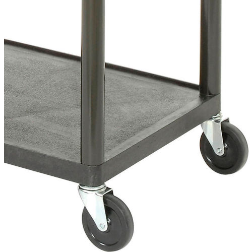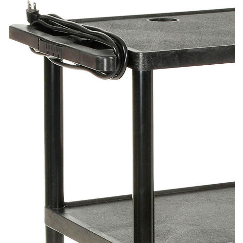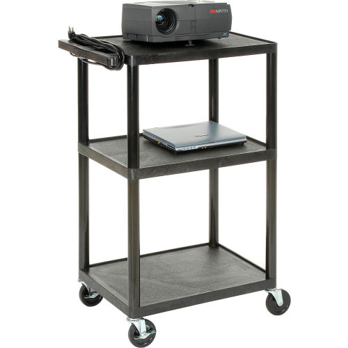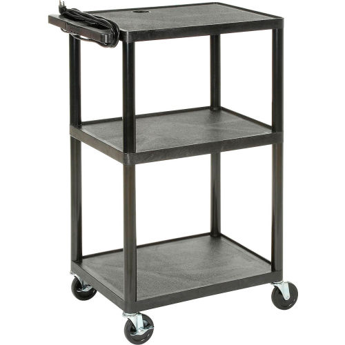 Plastic Audio Visual & Instrument Cart 32 X 24 X 40 Three Shelves - LP40E Convenient 3-outlet power strip with 15 ft. 3-wire cord provides at-the-source electricity. Transport, store and secure valuable, sensitive equipment. Frame and shelves constructed of tough, double-reinforced, non-conductive black ABS structural foam. Built-in handle. Shelves have retaining lip and textured surface to prevent equipment from sliding. 250 lb. capacity. Easy-rolling 4" ball bearing non-marring rubber wheel casters, 4 swivel (2 locking). Ready to assemble. Lifetime Limited Warranty.
