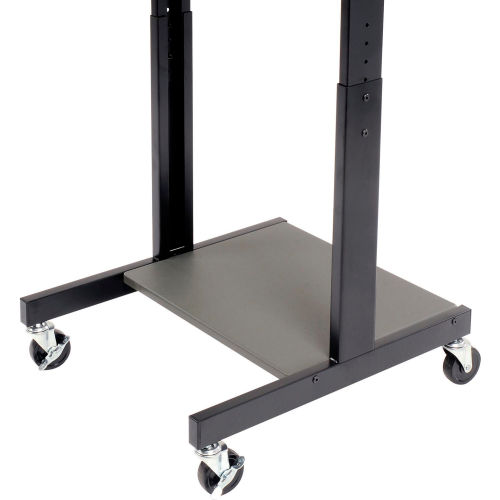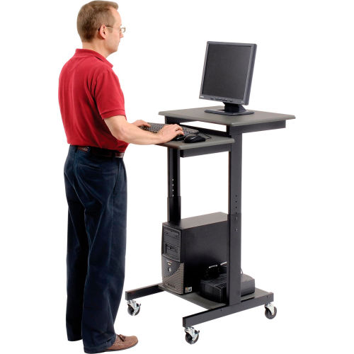 LUXOR PRESTIGE COMPUTER PRESENTATION WORKSTATION CART Mobile Audio Visual Cart Is Great For Desktop Or Laptop Computers Used During Presentations! The Adjustable-Height Presentation Workstation is a flexible, multipurpose and cost-effective unit ideal for use as a small computer desk, presentation station or lectern. A standing or sitting height and four 3" rolling casters with two locking brakes make the unit easy to relocate or stabilize. A black powder coat steel frame and wood laminate work surfaces offer lightweight yet sturdy construction that's built to last. Features: Multipurpose workstation ideal for use as computer desk, presentation station, or lectern Made with black powder coat painted steel frame and wood laminate work surfaces Rolling cart with four 3" casters, two with locking brake Max weight capacity (stationary): 176 lbs. Top Shelf - 77 lbs. Middle Shelf - 77 lbs. Bottom Shelf - 22 lbs. Max weight capacity (mobile): 110 lbs. Top Shelf - 44 lbs. Middle Shelf - 44 lbs. Bottom Shelf - 22 lbs. Assembly required Dimensions: Overall: 24"W x 31"D x 39" to 45"HTop Shelf: 24"W x 18"DMiddle Shelf: 24"W x 14"DBottom Shelf: 18.75"L x 15.75"W.