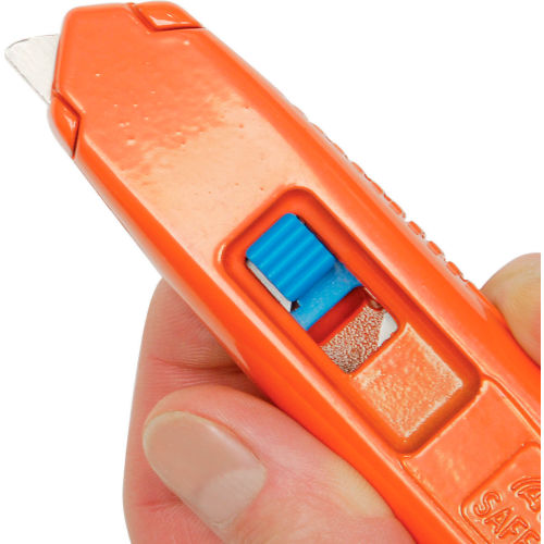 Self-Retracting Aluminum Safety Box Cutter With 6 Blades - SRK-B6 Reduces accidents, down time and compensation rates. Rounded point blades reduce the possibility of puncture injuries. Safety spring slider pulls the blade into the knife body automatically. Minimum blade exposure of only 3/8". Left/right operation. One button EZ opening - no screwdriver needed. Includes 6 blades. Sold 12 knives per box. - Pkg Qty 12.
