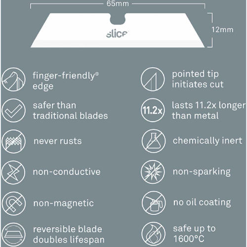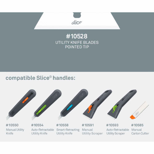 The Slice 10528 utility knife blades have a pointed tip for cuts that require a piercing action. As with all Slice safety blades, the 10528 blades are non-sparking, non-magnetic, chemically inert, feature no oil coating, and never rust. The proprietary Finger-friendly edge is safe to the touch, reducing injuries and lowering costs. These blades are compatible with several Slice handles: the 10550, 10554, 10558, and 10562 utility knives; the 10591 and 10593 scrapers; and the 10585 Manual Carton Cutter. Features: Blade Type: Pointed TipSafer than traditional bladesFinger-friendly edge cuts and scrapes effectivelyLasts up to 11.2X longer than metal bladesFewer blade changes = fewer injuriesReduces injuries, lowers costsNon-sparking, non-conductive, non-magneticOil and lubricant freePointed tip easily penetrates cutting materials100 percent recyclableBlade is safe from -40 C to 1600 CCompatible Handles: Slice 10550 (Global# B2314407), 10554 (Global# B2314406), 10558 (Global# B2314405), 10562 (Global# B2314402), 10591 ( (Global# B2314401), 10593 (Global# B2314399), 105853 dual-sided blades per pack MUST BE 18 YEARS OR OLDER TO PURCHASE THIS PRODUCT.