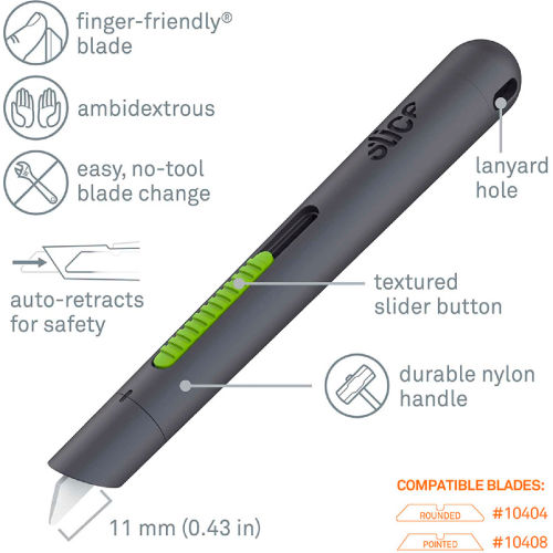 The Slice Auto-Retractable Pen Cutter offers an alternative handle profile to Slice's box cutters. Its slimmer cylindrical shape is ideal for hard-to-reach areas and it uses the same blades offering the same great features. These include Slice's proprietary Finger-friendly edge that reduces injuries. The pen cutter design limits the amount of exposed blade, further preventing accidental cuts. The blade retracts into its housing when the user releases the rubberized slider button. Features: Handle Type: Auto-RetractableHandle features rubberized slider buttonCompatible Blades: Slice 10404 (Global# 236539), 10408 (Global# B2314400)Finger-friendly edge stays sharp 11X longerNon-sparking, non-conductive bladeDurable glass-filled nylon handleNo-tool blade changeLanyard hole keeps tool handyFewer blade changes = fewer injuries MUST BE 18 YEARS OR OLDER TO PURCHASE THIS PRODUCT.