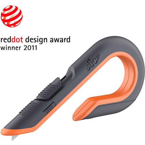 The Slice Box Cutter revolutionized safety with its ceramic safety blade and unique handle. Slice's safer ergo handle wraps around your hand, protecting you from staples while providing the perfect angle to expose only as much blade as you need. Used by more than half the Fortune 1000, the Finger-friendly blade lasts up to 11 times longer than steel and doesn't require a sharps disposal box. Suitable for single and double-walled corrugated. Features: Handle Type: 3-PositionDistinctive protective ergo J-hook handleCompatible Blades: Slice 10404 (Global# 236539), 10408 (Global# B2314400)Finger-friendly edge stays sharp 11X longerReduces injuries, lowers costsNon-sparking, non-conductive bladeIncludes 1 double-sided, round-tip safety bladeAmbidextrous designRed Dot Design Award winner MUST BE 18 YEARS OR OLDER TO PURCHASE THIS PRODUCT. - Pkg Qty 6.